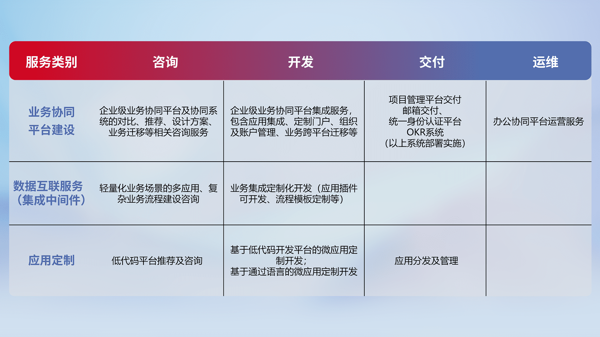 针对钉钉、、、企微、、、IDaas等平台级产品提供产品的规划、、、方案、、、交付、、、、定制化开发等服务,,,实现如统一协同办公、、、智能客户服务、、、、混合会议管理、、、智能数据查询、、、、等业务场景,,,实现数字化转型。。。。