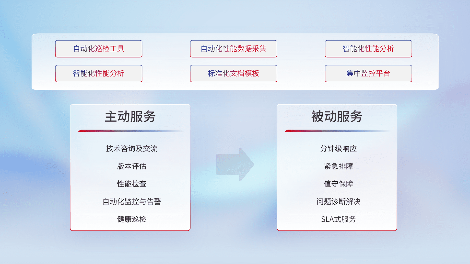 智能化工具和标准化文档,,,,保障服务质量,,提供主动服务(包含技术咨询、、版本评估、、、、性能检查、、、自动化监控与告警、、、、健康巡检)和被动服务包含(分钟级响应、、、、紧急排障、、、值守保障、、问题诊断解决、、SLA服务)。。。。