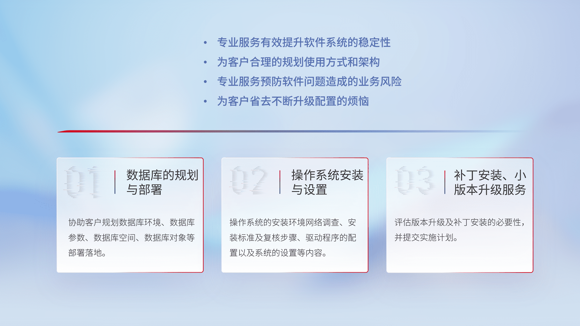 为客户提供软件规模升级、、、快速部署、、按需配置的专业服务,,从数据库的规划与部署到操作系统的安装与设置,,,再到补丁安装和小版本升级提供支持。。